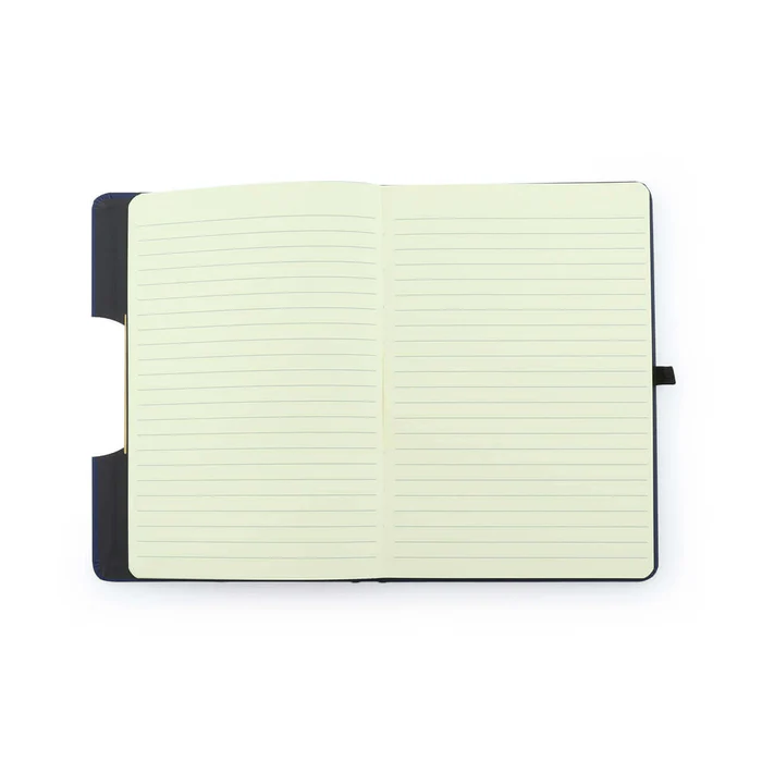 Libreta con carátula y contracarátula en cuero sintético, Porta celular en bambú, Porta esfero. *No incluye esfero, 100 hojas rayadas.